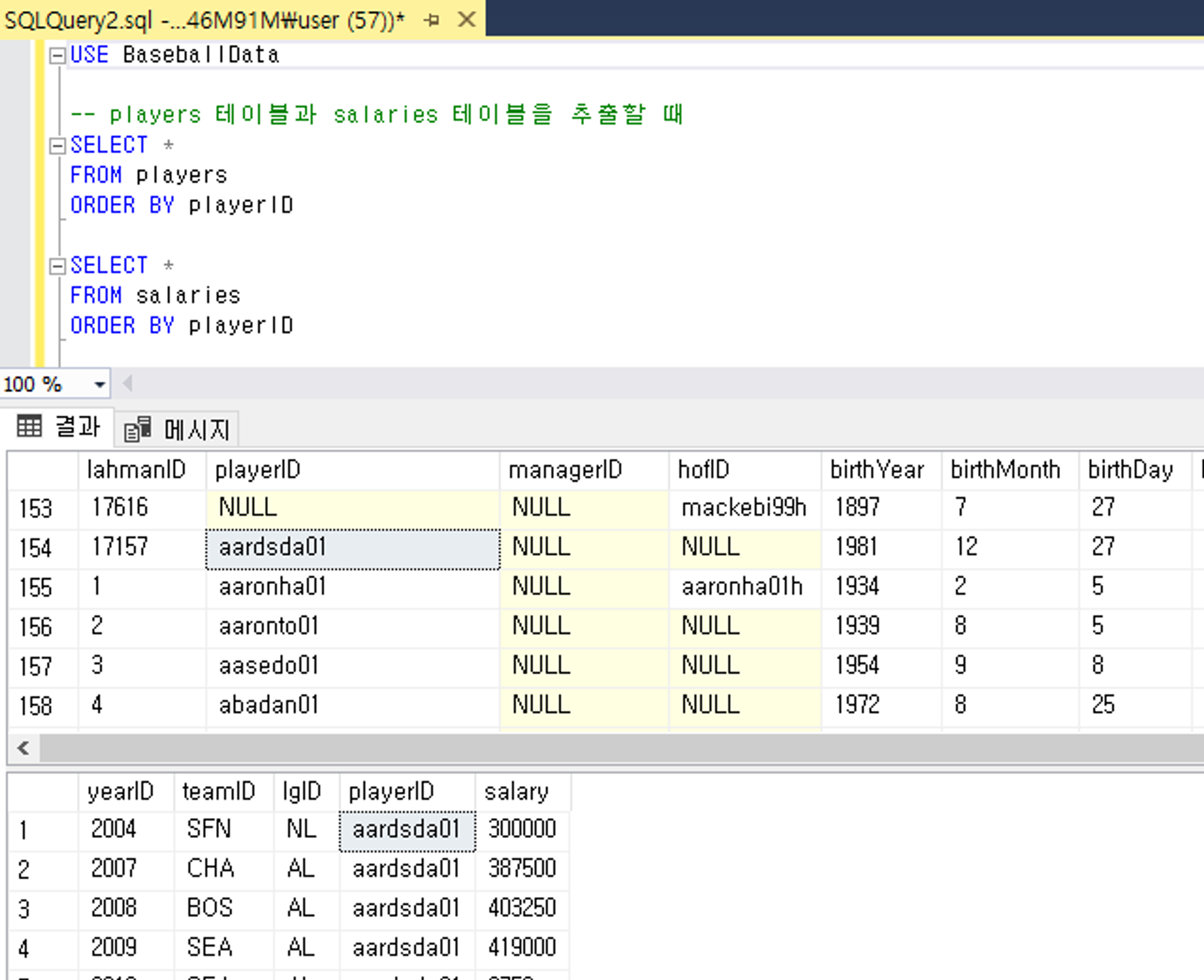 🤔 JOIN란 JOIN 연산자는 SELECT 다음으로 많이 사용될 정도로 중요한 연산자이다. 조인 연산자란 2개 이사의 테이블을 하나로 결합하여 집합으로 나타내는 것이다. 즉 서로 다른 테이블에서 정보를 가져올 때 사용된다. 2개 테이블을 각각 하나씩 추출하기 USE BaseballData -- players 테이블과 salaries 테이블을 추출할 때 SELECT * FROM players ORDER BY playerID SELECT * FROM salaries ORDER BY playerID 두 개 이상의 테이블을 추출할 때 위 이미지처럼 테이블을 하나씩 추출하여 볼 수 있다. INNER JOIN (내부결합) USE BaseballData -- INNER JOIN을 사용해 2개의 테이블을 결합 SEL..